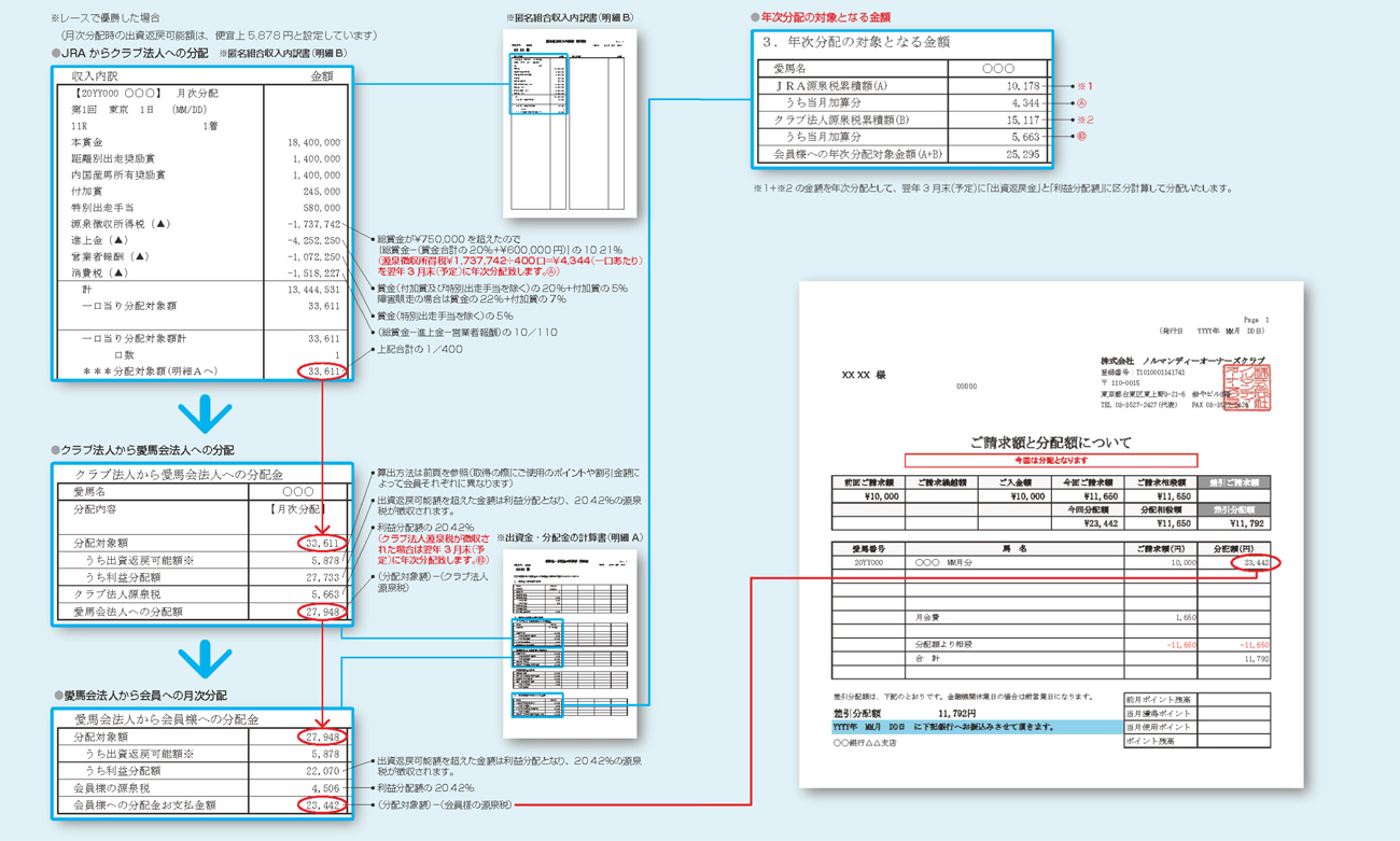 日に出走して獲得した賞金)に係るJRA(地方競馬)源泉税、並びにクラブ法人源泉税は、それぞれJRA(地方競馬)源泉税精算金、クラブ法人源泉税精算金として、当該計算期間終了後の翌年3月(予定)に「年次分配」として分配いたします。