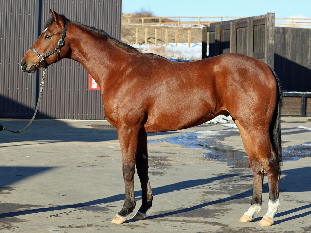 父タワーオブロンドンはスプリンターズS覇者で、5つの重賞勝利のうち2つがレコード勝ちという快速馬でした。初年度産駒のパンジャタワーがNHKマイルCを制し、2年目産駒からもオープン勝ち馬を輩出するなど早くもスピードタイプの種牡馬として頭角を現しています。本馬は牡馬らしく全身の筋肉量、骨量ともに申し分なく、胸の深さから心肺の大きさが見て取れ、豊かなスピードを持続させる源泉となることでしょう。母系を遡ればマイルCS勝ち馬をはじめ芝での活躍馬もおり、本馬も短距離戦線で息の長い走りを見せてくれそうです。