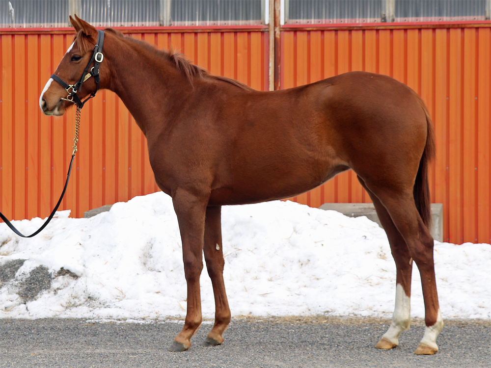 父ブリックスアンドモルタルは芝GⅠを5連勝した米年度代表馬。産駒からはダート交流GⅠ2勝馬が誕生するなど、芝、ダートの双方で活躍馬を送り出しています。いっぽう2代母にアルゼンチンの芝マイルGⅠの勝ち馬がいる母系からは、多数のステークスウイナーが輩出されており、活力は十分。本馬は肩の傾斜が良く、深みのある胸前や腰回りに力感がありながらも、歩様には芝適性を感じさせる柔軟なバネを秘め、素軽さとパワーを備えています。将来は中距離路線を中心に重賞戦線を盛り上げ、父の名を一層高めてくれることでしょう。