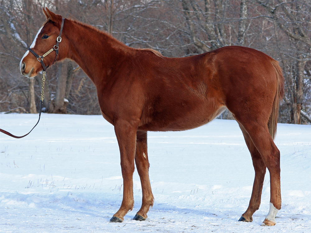 | 現在はダート坂路2本(上限20秒ペース)のメニューで調整しています。担当者は「年明けからは夜間放牧をおこなわず、騎乗調教を主とした調整を続けています。まだ蹄が薄く、ウッドチップの坂路だと馬場が硬くなり過ぎていることを考慮して、引き続きダート坂路に入れているという状況です。動き自体は良くて体力も付いてきているので、蹄の状態を確認しながら強度を上げていく予定です」と話していました。 |