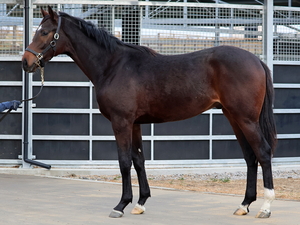 現在は屋内ダートコースでハッキングキャンター2000~2500m、週2回は屋内坂路1本(上限18~22秒ペース)のメニューで調整しています。担当者は「ロンギ場での馴致はひと通り終わり、今月から馬場での調教を開始しています。まだ始めたばかりなのでゆったりと進めている段階で、坂路では道中ハロン22秒前後で終い1ハロンのみ18~19秒で動かすという内容。スピード色の強いカラヴァッジオ産駒ではあるものの、短距離一辺倒というタイプではなさそうで、マイルぐらいまではこなせそうなイメージです。ウチの生産馬なのでセリで購買いただく前もこちらにいましたし、それを思い出したのか環境にはすっかり慣れた様子。普段から特に手が掛かることもなく進めやすいです」と話していました。