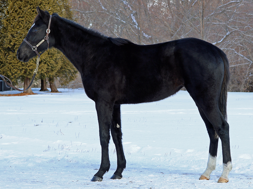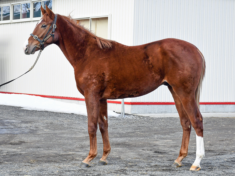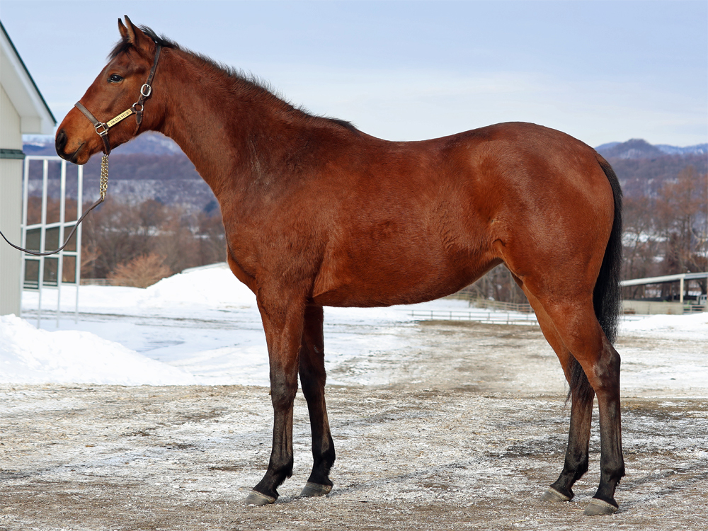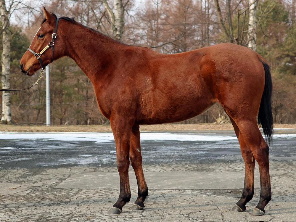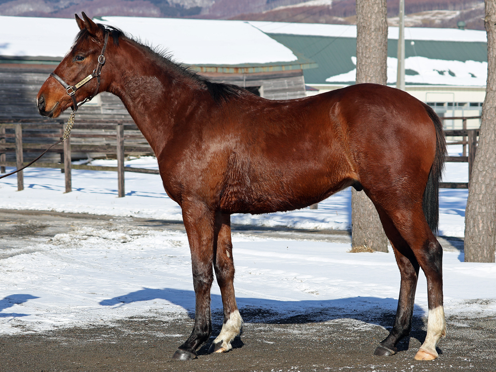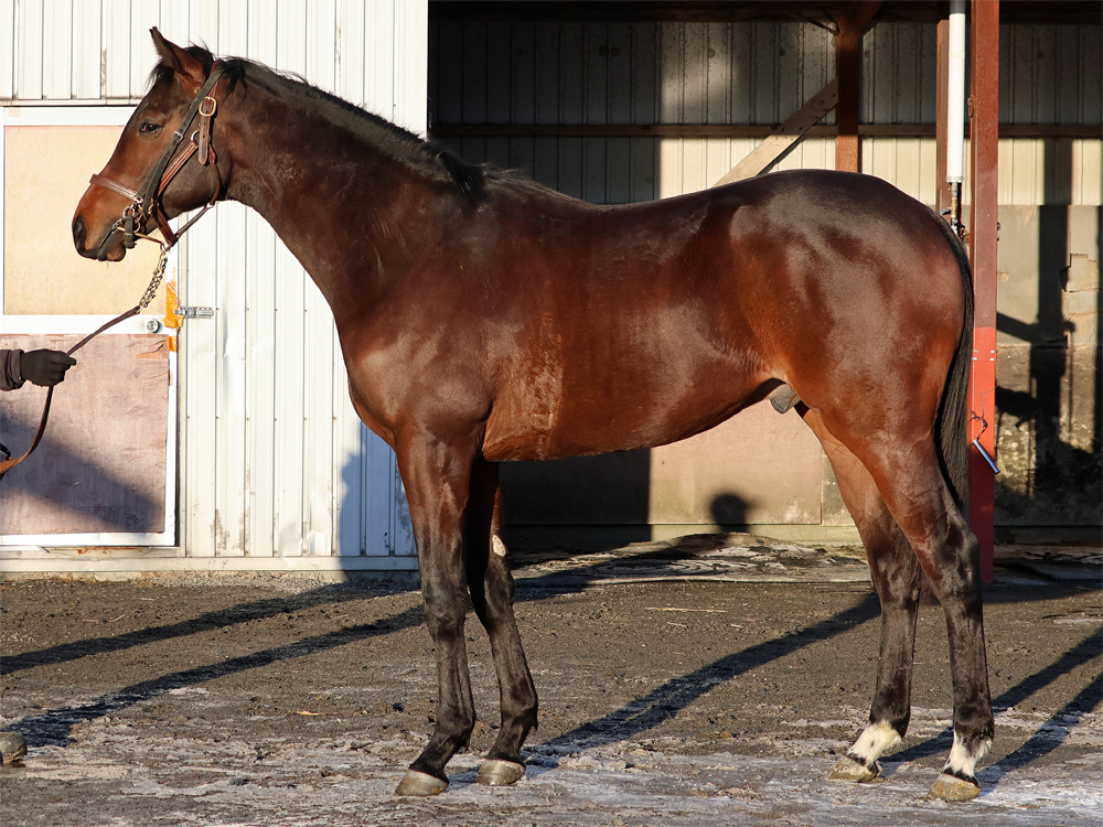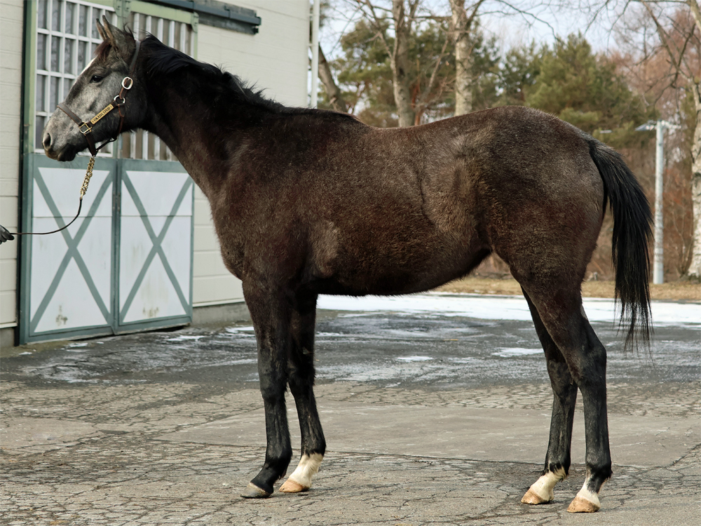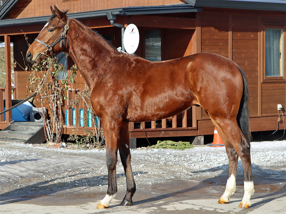 現在はBTCの屋内600mダートコースでハッキングキャンター2400~3600m、屋内1000m坂路1本(上限18秒ペース)のメニューで調整しています。担当者は「ここまでスムーズに進められているため、今は坂路で18秒を切るくらいのところを乗っています。少し子供っぽい面は残っていて、調教時もチャカチャカすることはありますが、坂路では楽に動けていますし、走り自体はしっかりしています。ステイゴールドの系統らしく、コンパクトな馬体ではあるものの、そのぶん素軽さやバネ感が目立つタイプ。ひと冬を越えて力が付いてきたら楽しみです」と話していました。